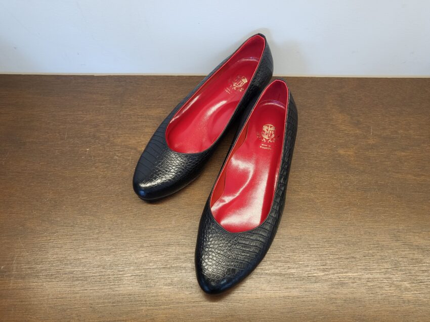小柄のクロコ型押し×赤いライニングのローヒールパンプス。黒と赤はとても相性の良い組み合わせです。