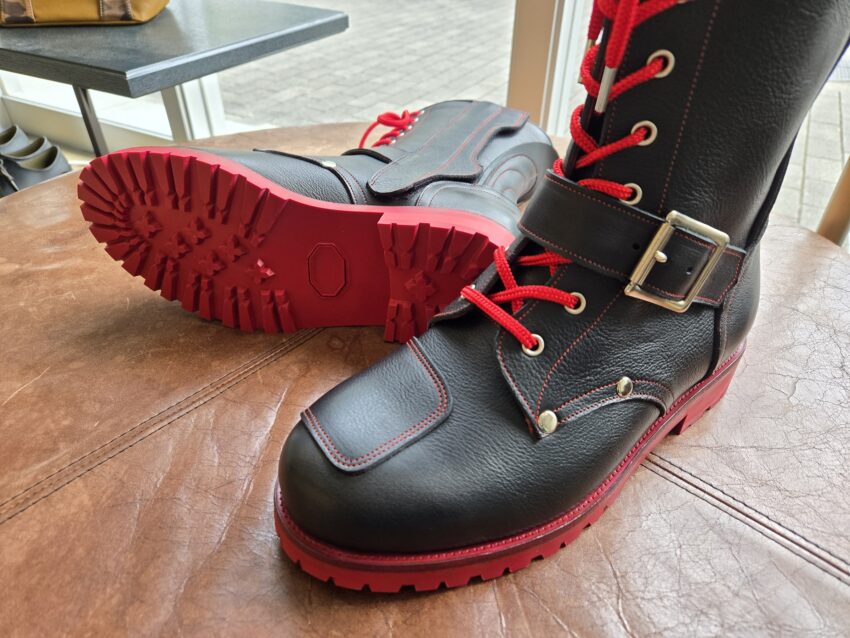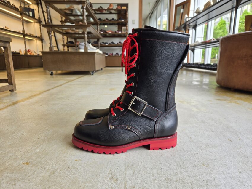 今お持ちのブーツは「動くとズボンの裾がブーツから出てきてしまってそれを毎回直さなきゃいけないのが大変で」というご相談から、丈の長さを丁度いい長さに設計し、ついでにお好きな色「赤」を靴の内側、ヒモ、ステッチ、ソール(タンクソール)に使用したお客様完全オリジナルのブーツです。