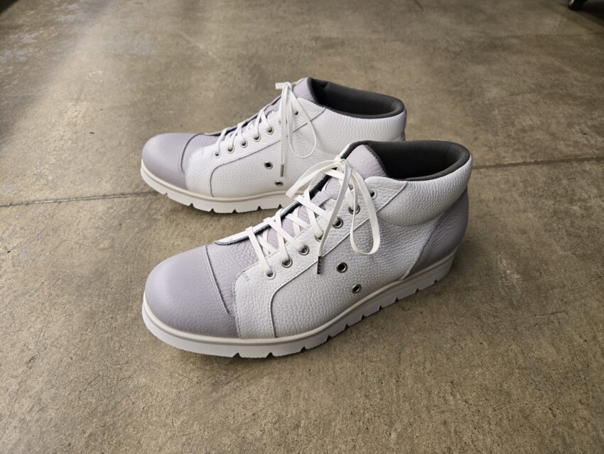 tom-028と比べデザイン的には少しの変化ですが、サイドの飾り帯をハト目にすることで通気性がUP。蒸れにくく長時間快適に過ごせます。今回使用した軽量の厚底はクッション性に優れ履き心地は抜群。厚さ違いのEVA(3,5,10ミリ)を組み合わせればお好みの弾力に調整が可能で自分好みの柔らかさに仕上げることができます。それにより膝や腰の負担を少なくすることも可能です。丈はくるぶしが隠れるくらいの長さで、足を優しく包んでくれ安心感と安定感があります。ハイカットなのにとても軽いのもこのスニーカーの特徴の一つです。