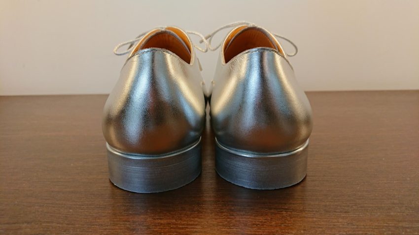 アッパーはもちろんシルバーの革で作らせていただきましたが、できる限り全体をシルバーで作りたいとのご要望でしたので、今回はソール部分もシルバーで染めあげ、靴紐もシルバーで仕上げさせていただきました。