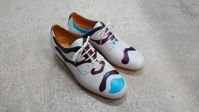 今まで靴は沢山作ってきましたがこのパターンは初めてでした!!歌舞伎メイク柄に染める「歌舞伎パティーヌ!!」。左右違う顔で、踵には左右お揃いの三色切り替えがしてあります。しかもタップシューズなんです。ダンス姿を想像するだけでワクワクします!!間違いなく世界に一足しかない特別な靴ですね。とてもいい感じです。作らせて頂きありがとうございました。