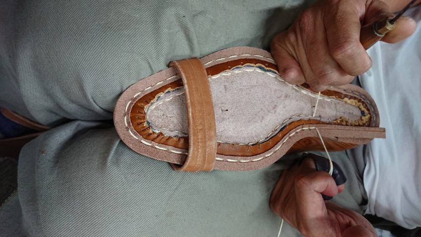 *画像は、中底・アッパー・ウェルトを同時に縫い上げるすくい縫い