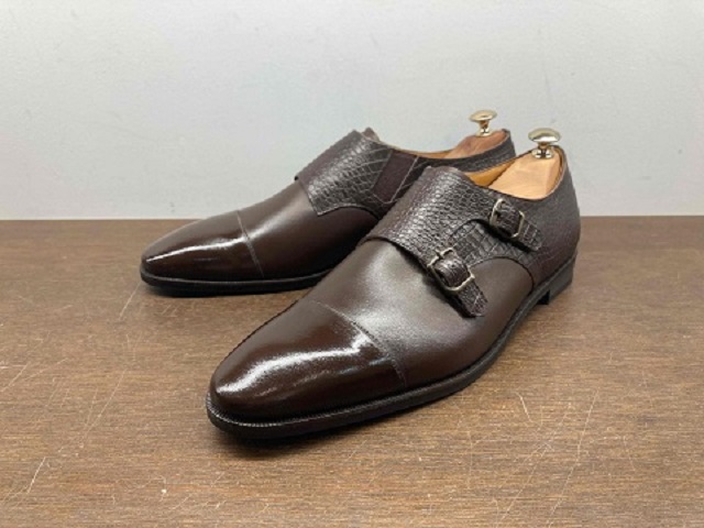 今回ご紹介させて頂く靴はtak027 ダブルモンクシューズをご紹介させて頂きます。こちらの靴のオススメポイントはサイドゴアシューズとダブルモンクシューズをミックスしたありそうでなかったシューズになります。内側にデザイン性のあるスッキリとしたサイドゴムを追加した事で尾錠をその都度外したりしなくてもよくなりました。尾錠のついたデザインは好きだけど、脱ぎ履きは面倒だから抵抗あったりする方に特にオススメしたいモデルとなっています。今回は2枚目の画像のようにつま先をハイシャイン仕上げと言ってワックスを使用して磨き上げ、部分的に光沢を鋭くしてトーンを出して仕上げてみました。1枚目の画像と比べると違いが分かりやすいかと思います。個人的にはフォーマルな時にはハイシャインをしていただくとよりフォーマル度が増してカッコ良いと思います。カジュアルはもとよりスーツにも幅広く使えるダブルモンクは一足あると重宝しますので、オススメです。